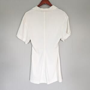 Super cute and unique dress for the summer, going out, bachelorette, cocktail party, etc! Open short sleeves, stomach cut out, twisted and tied front. Button detailing on the skirt, side zipper closure, has some stretch.