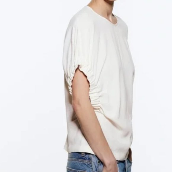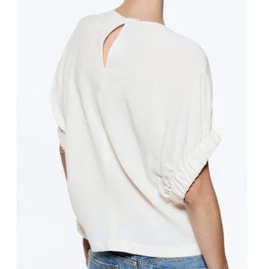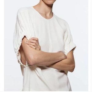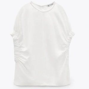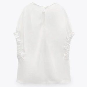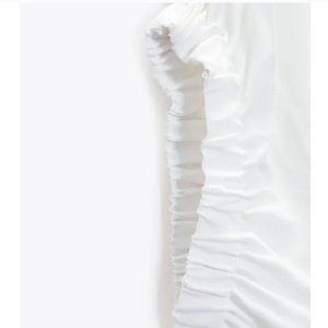 Top with a straight-cut neckline and adjustable thin straps. Featuring a voluminous flower detail and ruffles in the same fabric. A front opening, elastic smocking at the back, an asymmetric hem and invisible zip fastening.
