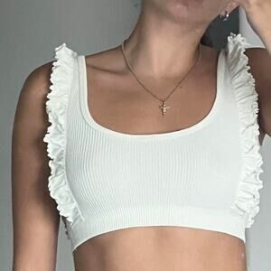 ZARA White Ruffle Frill Scoop Neck Ribbed Knit Stretch Cropped Tank Top Sz XS/S