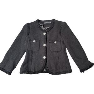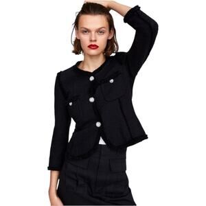 Chic and elegant black bouclé tweed jacket from ZARA Woman, size XS. Features striking rhinestone statement buttons, fringe trim, and a tailored silhouette reminiscent of classic styling. This jacket includes two front flap pockets, soft lining, and 3/4 sleeves for a modern, feminine touch. Perfect for work, events, or elevating a casual look. Gently worn and in excellent condition.