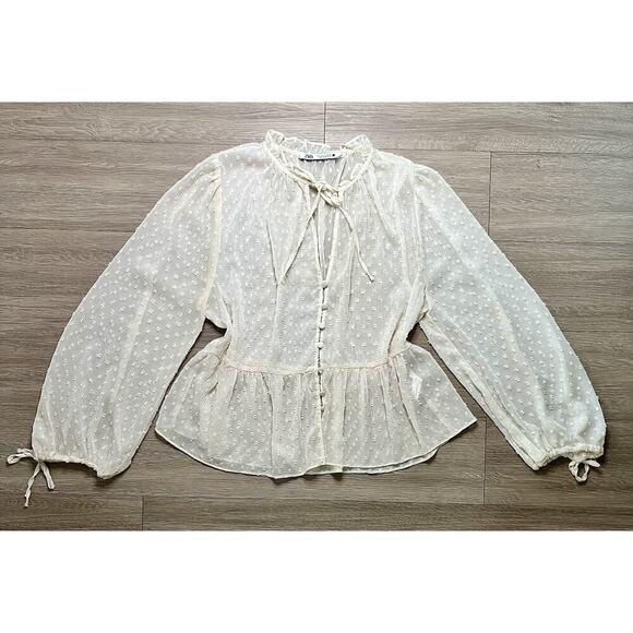 Elegant and feminine ZARA Woman blouse in a sheer ivory white fabric with textured dobby dots. Features a tie-neck detail, button front, peplum waist, and long puff sleeves with tie cuffs. Lightweight and flowy, perfect for a chic boho-inspired look.