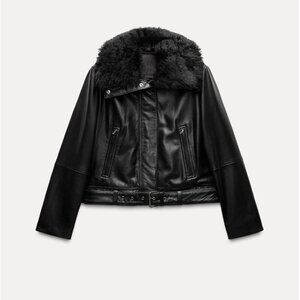 ZARA Women $349 100% Leather Jacket Black Removable faux fur collar XS NWT