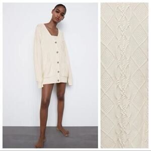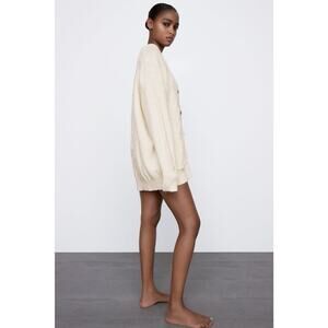 ZARA Women Long Sleeve Button Rib Trim Pointelle Knit Cardigan Size S Ecru