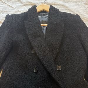 Step into timeless style with this chic black bouclé double-breasted coat from ZARA. Made from a warm wool-blend fabric, this coat offers both elegance and comfort perfect for the fall and winter seasons.