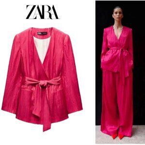 ZARA Womens Blazer Hot Pink Fuchsia Satin Belted Tie Double Breasted Size L