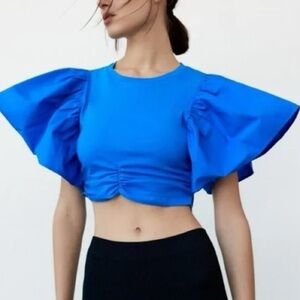 This chic crop top from Zara features a striking blue hue and playful flutter sleeves. The ruched design adds a touch of elegance, making it a versatile piece for any stylish wardrobe.