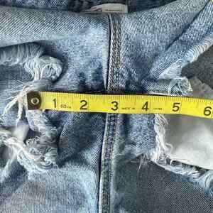ZARA women's distressed jean shorts. High-rise. Metal button and zipper closure. 5-pocket. Belt loops. In good used condition.