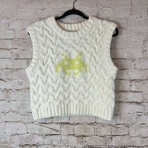 Women's ZARA X Space Invaders Pacman Vest Size Large. Cream & Lime Green Cropped Sleeveless Rachatta Crew Neck made of Acrylic, Nylon & Polyester. This is a Blogger Favorite and is SOLD OUT online. Gently Used. Please see pictures for details.