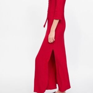ZARA Women's Red Crochet Knotted Bib Maxi Dress 3/4 Sleeve Sz S