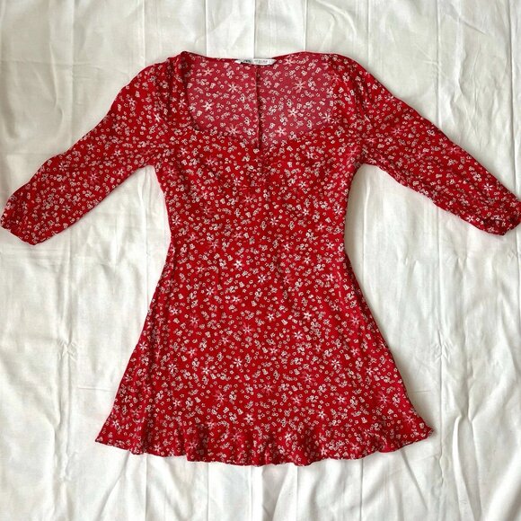 ZARA Women's Red Floral Print 3/4 Sleeve Ruffled Mini Dress
