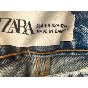 These Zara jeans offer a comfortable fit with a relaxed silhouette, crafted from soft cotton. Ideal for casual wear, they feature a classic light blue color, combining style and ease for everyday outfits. Zara jeans, relaxed fit, light blue, women's jeans, cotton jeans, size 12, size 14, casual wear, five pockets, denim patches, comfortable fit, everyday jeans,
