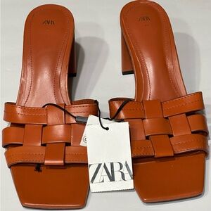 ZARA Women's Square Open Toe Heeled Slip on Sandals in Brown. New with Tags, Retail $79