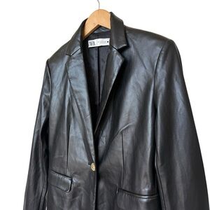 Keywords: ZARA blazer, faux leather jacket, women's blazer, black blazer, medium size, notched lapel, casual jacket, button closure, women's fashion, stylish blazer, pre-owned blazer, chic outerwear, versatile jacket, office wear, casual wear.
