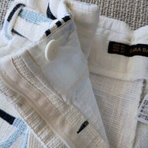 Lightweight and effortlessly chic, these Zara linen-blend shorts feature a relaxed fit with a self-tie belt and tropical-inspired print — perfect for warm weather styling.
