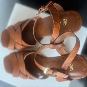 Stylish and versatile platform block heel sandals from ZARA in a warm caramel/cognac shade. Designed with wide crossover leather straps, an adjustable ankle strap, and a sturdy wooden block heel for both comfort and height.