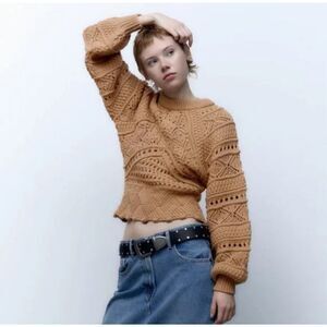 ZARA Wool Brown Chunky Crochet 3D Open Knit Balloon Sleeve Pullover Sweater sz S