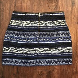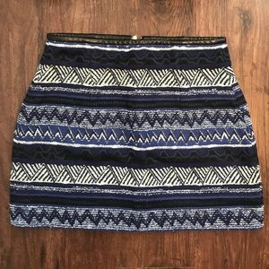 This woven mini skirt by Zara is funky and fun. It features blue, navy, and white stripes and patterns with a black leather detail at the waistband and silver zipper in the rear. Size XS. Measures 15" in length.