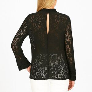 Add a touch of charm to your wardrobe with this sheer black floral lace blouse.