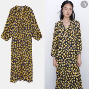 ZARA Yellow Floral Midi Dress Summer Blogger Favorite Navy Blue {D29}