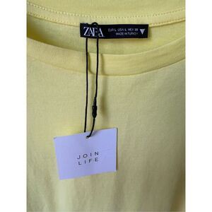 Brighten up your wardrobe with this playful yellow tee from Zara. Crafted from 100% cotton, it features soft ruffled flutter sleeves that add a feminine touch to the classic silhouette. The cropped length and crew neck design offer a modern, laid-back vibe—perfect for pairing with high-waisted jeans or skirts for an effortlessly chic look