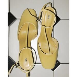 Vanilla yellow leather slingback heels. Strap detail at the front. Thin mid-height heel. Ankle strap with buckle closure. Squared toe. From ZARA, in US size 7.5 (EUR 38). New with tags. Sold out in stores.