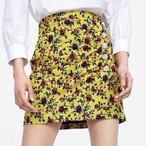 ZARA Yellow Multi Floral Rhinestone Button Mini Skirt Size S