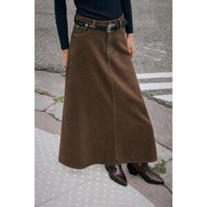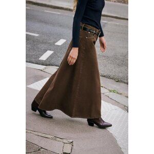 High-waist skirt with five pockets. Flared hem. Front zip and metal button fastening.
