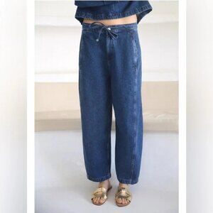 ZARA Z1975 HIGH-WAISTED DRAWSTRING JEANS. Mid-blue L $69.00 MSRP. Worn once.