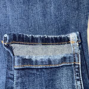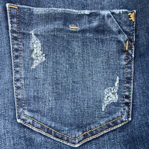 Mid rise five pocket jeans. Washed effect. Ripped detail and unfinished hem. Front zip and jewel button closure.