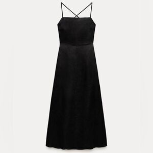Midi dress made of 100% linen. Straight neckline and spaghetti straps that cross and tie in back. A-line silhouette. Hidden in-seam zip closure.