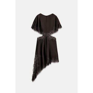 Midi dress made from satin fabric. Round neck and cape sleeve. Side cut-out detail and tonal lace appliqué. Inner bralette in the same fabric with thin straps and adjustable fastening. Asymmetric hem. Back closure with opening and button.