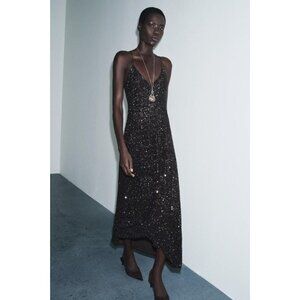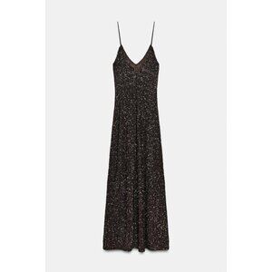 New with tag ZARA WOMAN COLLECTION Long dress with a V-neckline and thin straps. Sequin appliqué detail. Flared hem. BROWN | 9535/108/700 OUTER SHELL 95% polyester 5% elastane Which has at least: OUTER SHELL 95% RCS-certified recycled polyester 5% RCS-certified recycled spandex