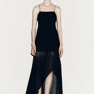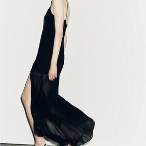 ZARA WOMAN COLLECTION Long straight neck dress with spaghetti straps. Asymmetric hem with tonal fabric and front opening. Side hidden in-seam zip closure.