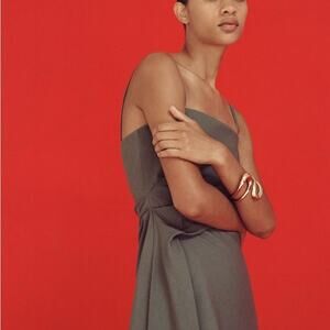 Dress made of wool blend fabric. Straight neckline and spaghetti straps. Self lined interior. Draped fabric at waist and side slit. Hidden in-seam side zip closure.