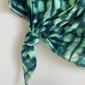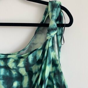 Stylish one-shoulder top with a green tie-dye pattern. Features a unique knot detail.