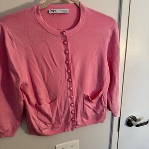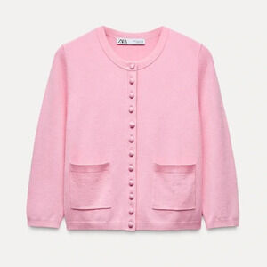 Round neck jacket with below-the-elbow length sleeves. Front patch pockets. Rib trim. Front closure with tonal lined buttons.