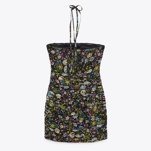 ZARA paisley print black polyester mini dress. Draping all over Halter neck ties. Smocking in the back. Side hidden zipper. New with Tags. Size M. Non-stretch fabric. Curve-hugging bodycon style dress. Very flattering.