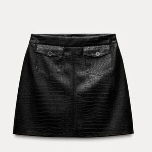 High-waisted embossed skirt with front patch pockets with buttoned flaps. Hidden zip closure at side.