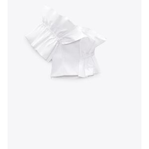 NWT made of 100% linen asymmetric neckline top, maxi self ruffles detail with pleats, smoked elastic detail at back, side hidden in-seam zip closure