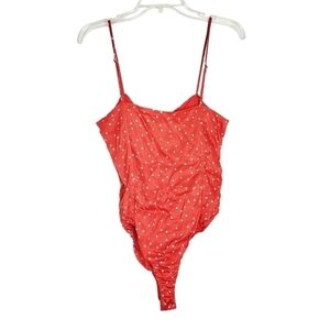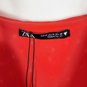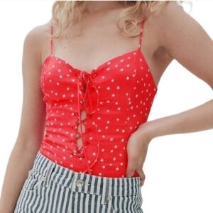 Zara satin effect lace up bodysuit in red with white mini stars. Adjustable spaghetti straps. Lace up neckline. Snap button closure on thong bodysuit. Perfect for summer!