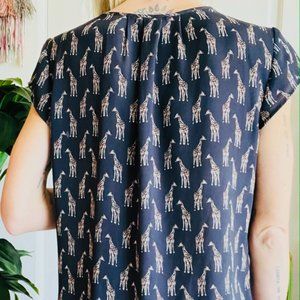 semi- sheer short-sleeved shirt from H&M. navy blue with repetitive giraffe pattern