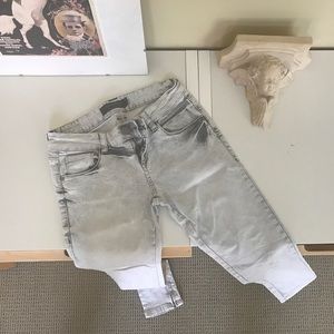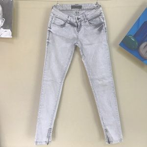 Great pair of light grey jeans with zips on the inside ankles! Skinny fit- the fabric is perfectly stretchy enough to give it that really good fit. Mid/lower waisted. Super fun pair of jeans to amp up you outfit by adding a little edge with the zipper! You can pair them with just about anything. 🌻🌼