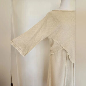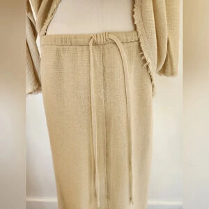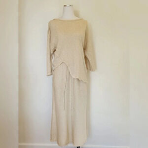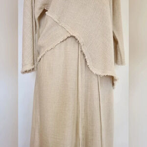 Beautiful Zara skirt and shirt set in a creamy colored woven fabric. This is a size small. The shirt has a boat neck, dolman style sleeves that are ¾ length, and an asymmetrical bottom hem. The edges are raw but hems are double reinforced for style and structure. The skirt is a midi length with a slight a-line style. The waist is tightened by a tie and bottom of skirt hem has same double reinforced, raw hem as shirt. There is a surged seam down front and back of skirt. I absolutely love this outfit and wish it still fit. I wore it a few times, hand washed and hung dried.