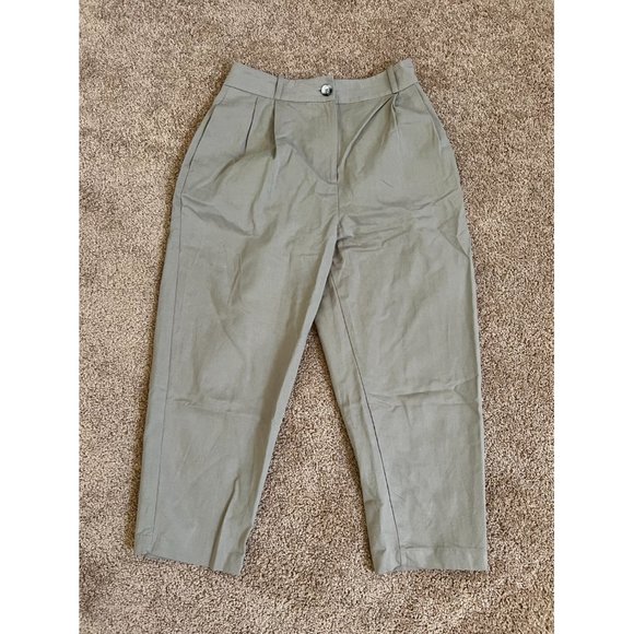 High waisted ZARA pants, slightly cropped at ankle. Kinda has a khaki vibe but in a "carrot pant" shape - a nipped-in waist with volume around the hips and then a slight taper toward the ankles. Front pleat details. Color is closest to a taupe - kinda mushroom-y, leaning gray, with a hint of olive. Really good neutral shade imo.