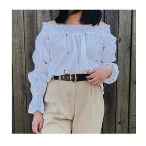 This Trafaluc Collection off-the-shoulder top is perfect for summer. Dress it up or down for any occasion! The floral embroidered details add a lovely pop of color. It is in great condition and ready for a new home!