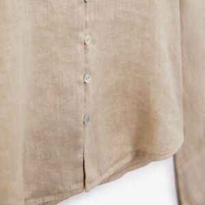 V-neck lapel collar shirt with long flared sleeves. Front button closure.