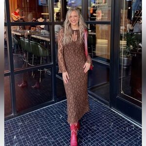 Long dress with a round neck and v-neck with tie detail. Semi-sheer long sleeves with flared cuffs. Matching lining. Concealed side zip fastening.