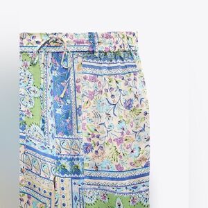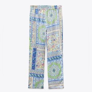 Printed high-waist pyjama bottoms with an elastic waistband and adjustable drawstrings. Side pockets. Straight-leg design.