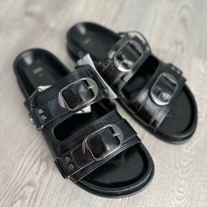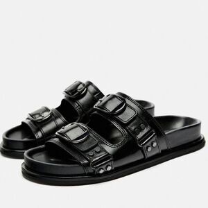 Flat leather sandals. Straps with buckles and metal appliqués. Round toe.