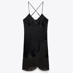 Dress with V-neckline and adjustable spaghetti straps. Fringed hem. Back hidden in-seam zip closure.